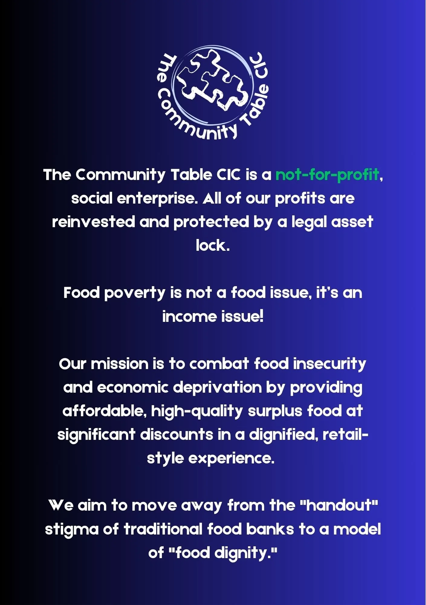 Stock Availability: I understand that The Community Table sources surplus and rescued food. While the team works hard to keep shelves full, stock is not guaranteed. The CIC is not liable for any specific items being unavailable, nor for temporary shop closures due to logistics or staffing.